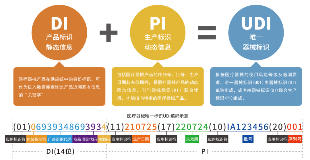 產品標識(DI):為識別注冊人/備案人、醫療器械型號規格和包裝的唯一代碼,是產品的靜態信息。