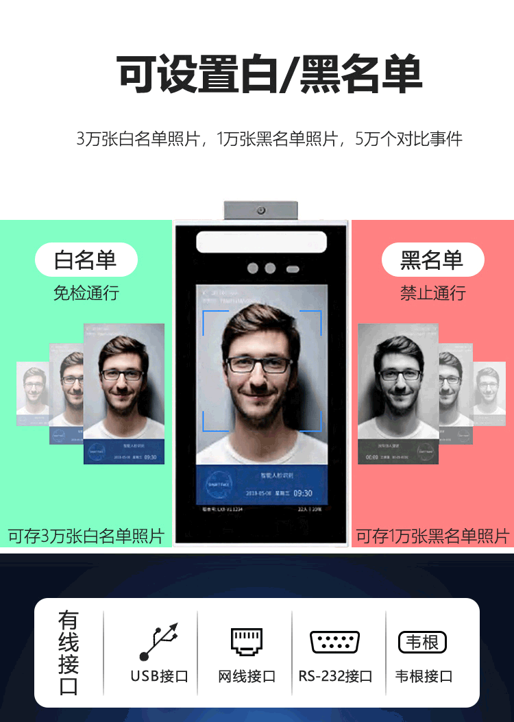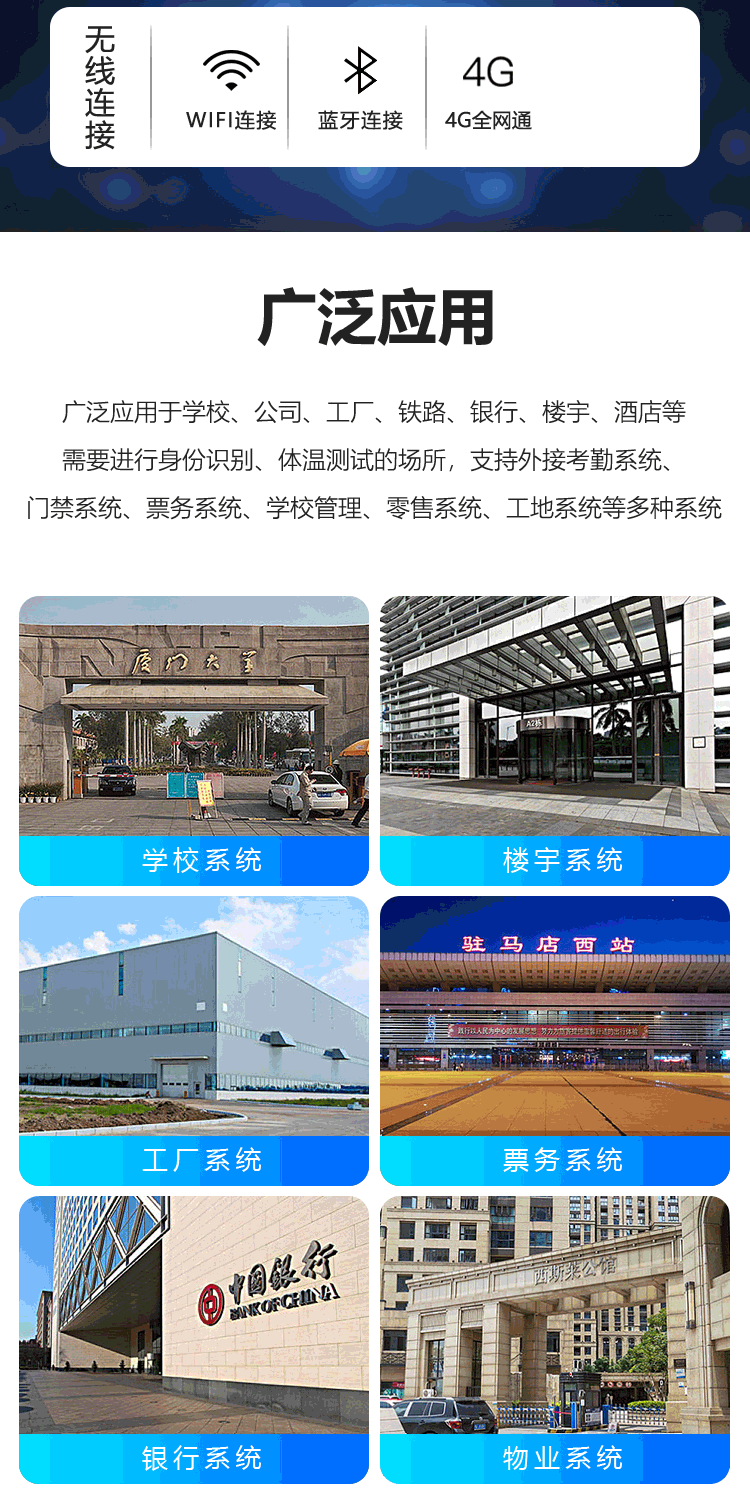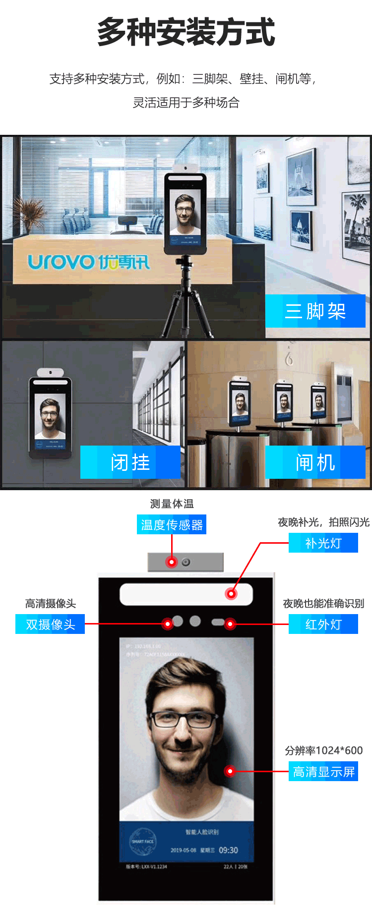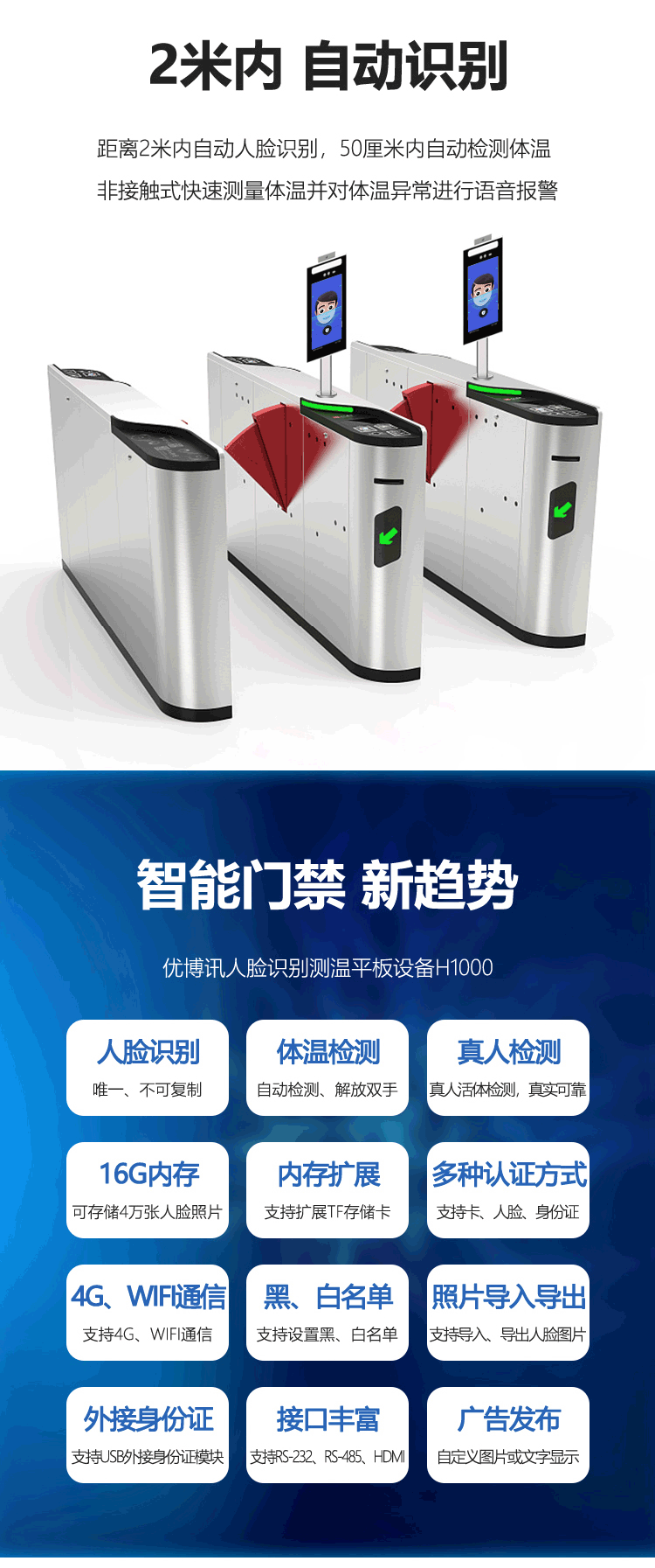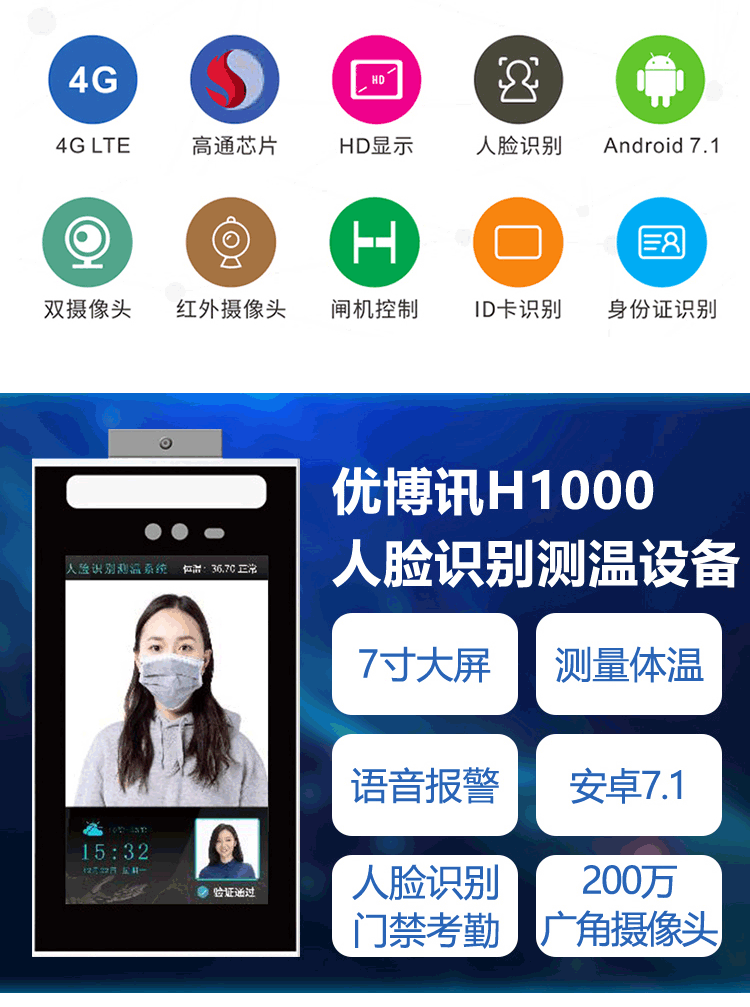 H1000人臉識別測溫平板設(shè)備是一款基于Andriod系統(tǒng)的嵌入式認(rèn)證設(shè)備。H1000支持人臉 測溫功能,可快速準(zhǔn)確測試人體溫度, 并對體溫過高進(jìn)行報(bào)警。主要應(yīng)用于學(xué)校、公司、工廠、鐵路、銀行、樓宇、酒店等需要進(jìn)行身份識別、體溫測試的場所。