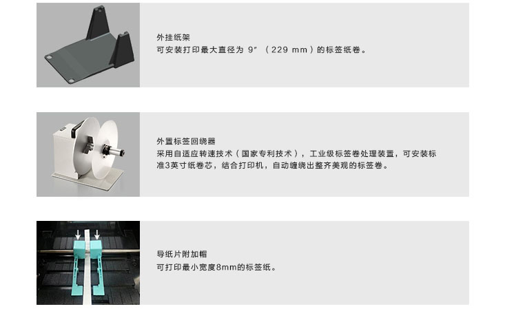 可選附件 | 切刀,Centronics 并口,外掛紙架,剝紙器,外置標簽回繞器,導紙片附加帽(最窄導紙寬度為8mm) |