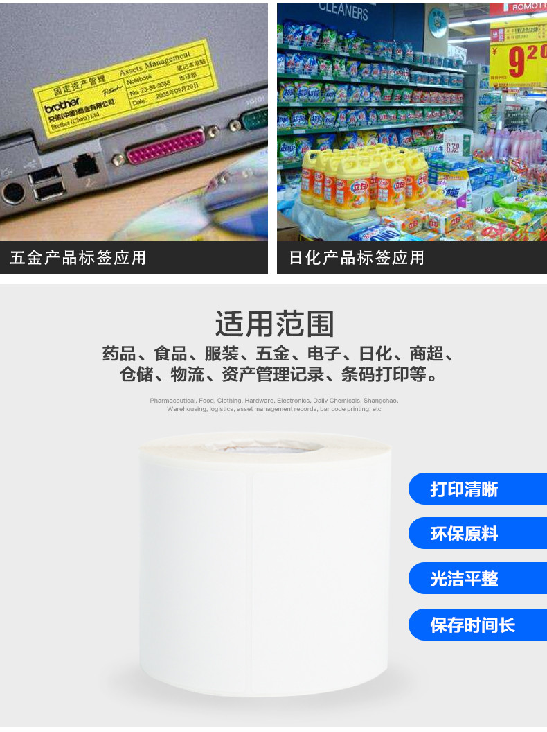 艾利銅版紙標簽。顏色一般為亮白和亞光,也可定做各種顏色,規(guī)格根據(jù)客戶需要量身定做,是一種半高光白色涂料紙,基本克重80 克/ 平米,表面基材厚度72 番,標簽整體厚度147 番。使用溫度范圍-50 度+90 度,最高貼標簽溫度+7 度。 使用范圍:廣泛應用于超市、庫存管理、服裝吊牌、工業(yè)生產(chǎn)流水線,適用于促銷及工業(yè)上的半高光彩色印刷。典型用途如化妝品標簽,藥標及食品工業(yè)標簽。可貼于大多數(shù)基材的平面及簡單曲面,包括紙板、塑料薄膜。