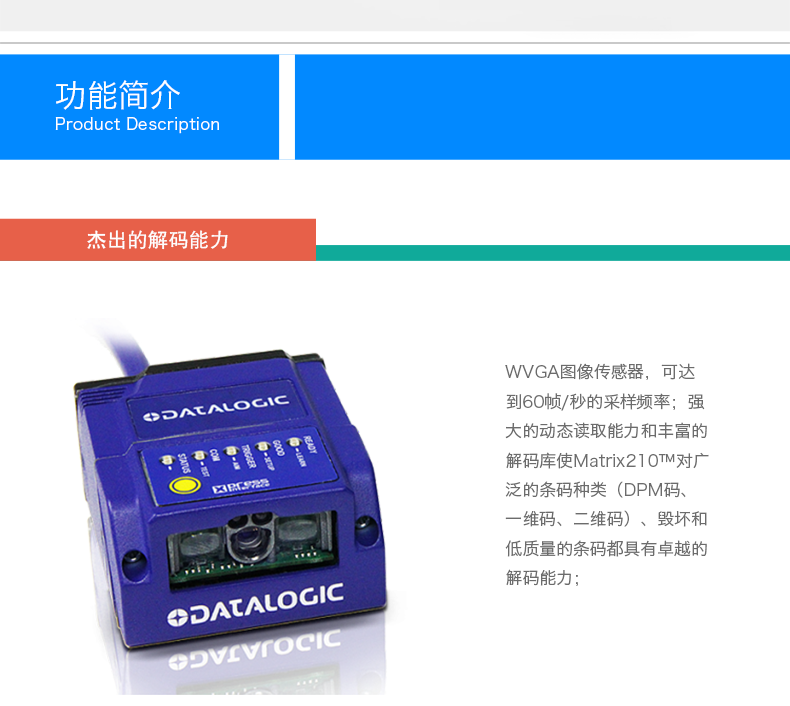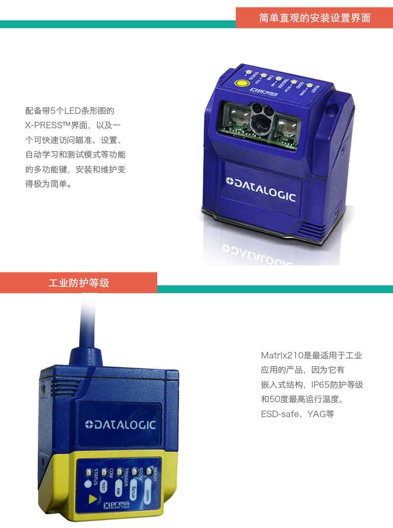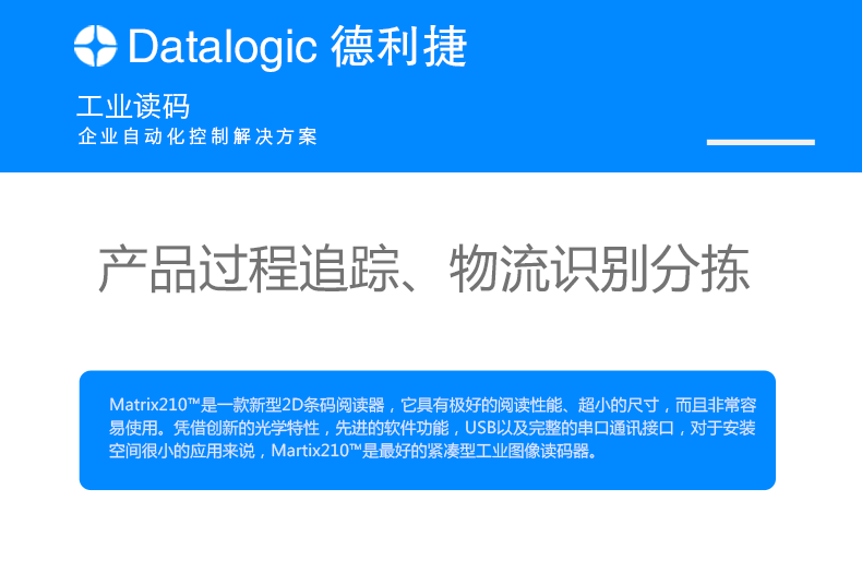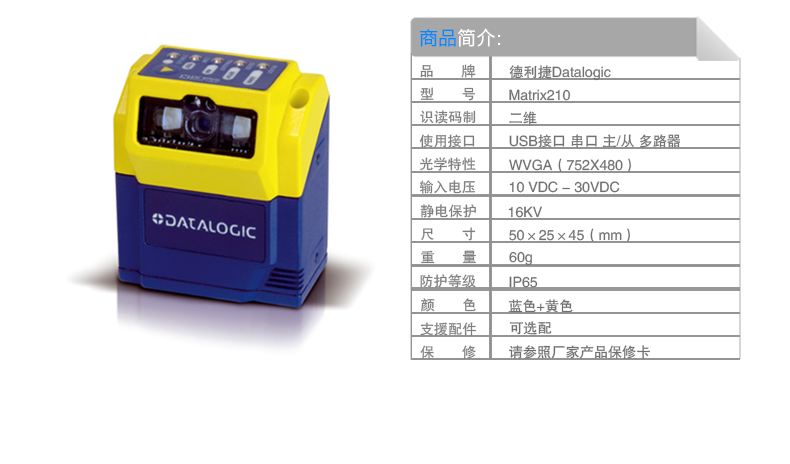 得利捷 datalogic Matrix210具有極好的閱讀性能、超小的尺寸,而且非常容易使用。憑借創(chuàng)新的光學(xué)特性,先進(jìn)的軟件功能,USB以及完整的串口通信接口,對于安裝空間很小的應(yīng)用來說,Matrix210是最好的緊湊型工業(yè)圖像讀碼器。(Matrix210是Matrix200的升級版,其功能更強(qiáng)大,性能更高,并且有帶以太網(wǎng)接口型號可選)