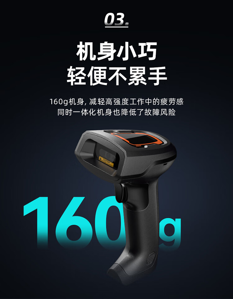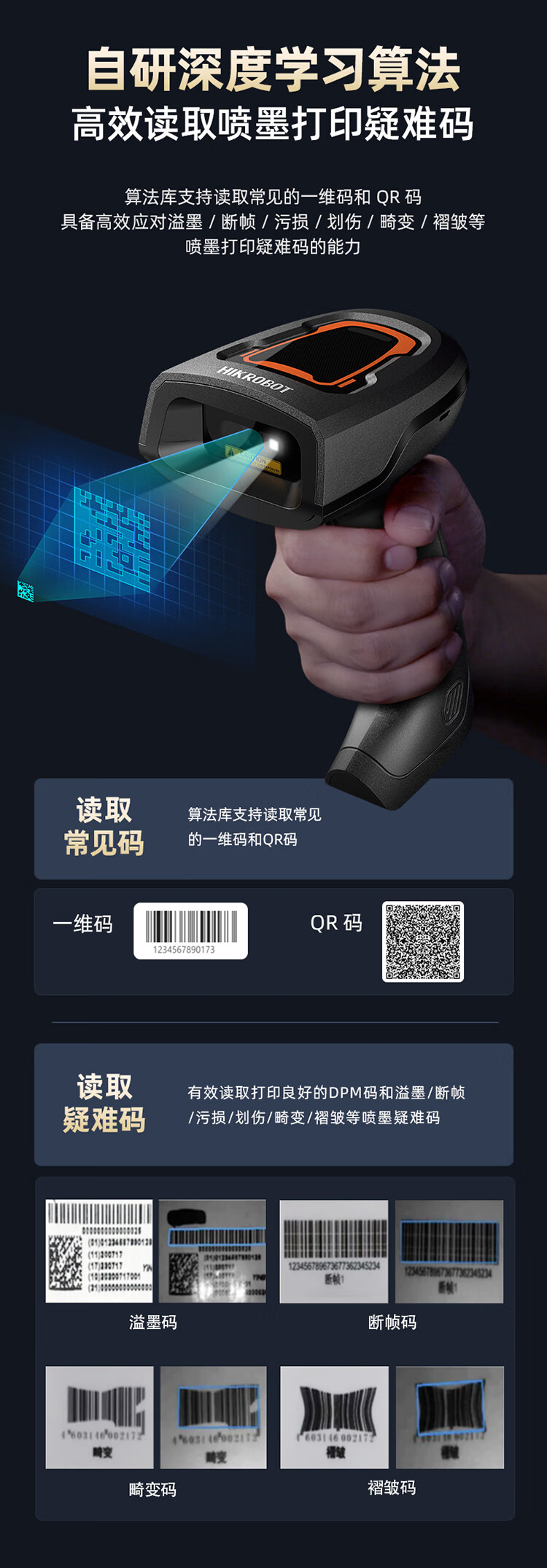 海康MV-IDH2003系列手持讀碼器具備30萬全局圖像傳感器,搭載NPU+CPU雙核處理器,支持讀取各種主流碼制的條形碼,可高效讀取噴墨/打印疑難碼,支持USB-HID、USB-CDC、RS232三種通信接口,輕便小巧,具有良好的易用性。