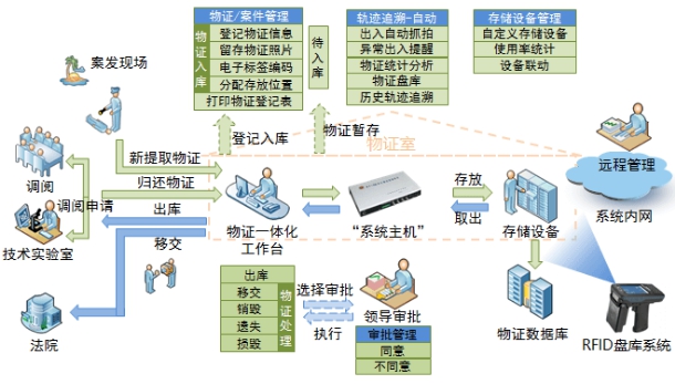 RFID公安局物證管理系統由RFID標簽、RFID讀寫器、RFID應用系統、報警系統等組成。