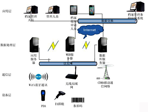 檔案管理條碼系統在檔案的標識采用條碼與無線射頻RFID等自動識別技術,在數據采集方面采用最新的802.11B協議的可靠移動數據采集與計算技術。