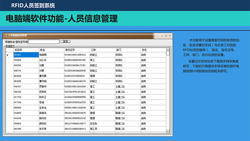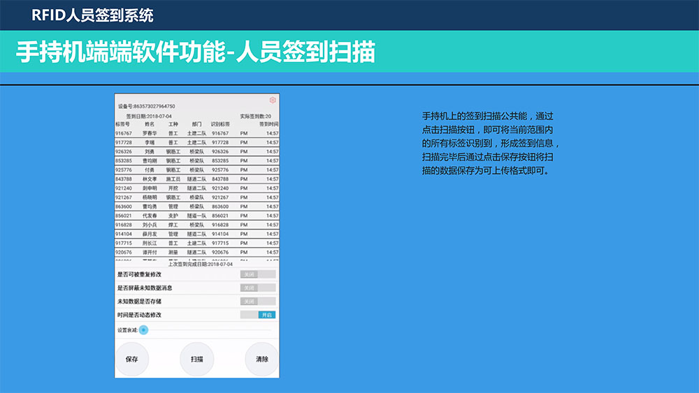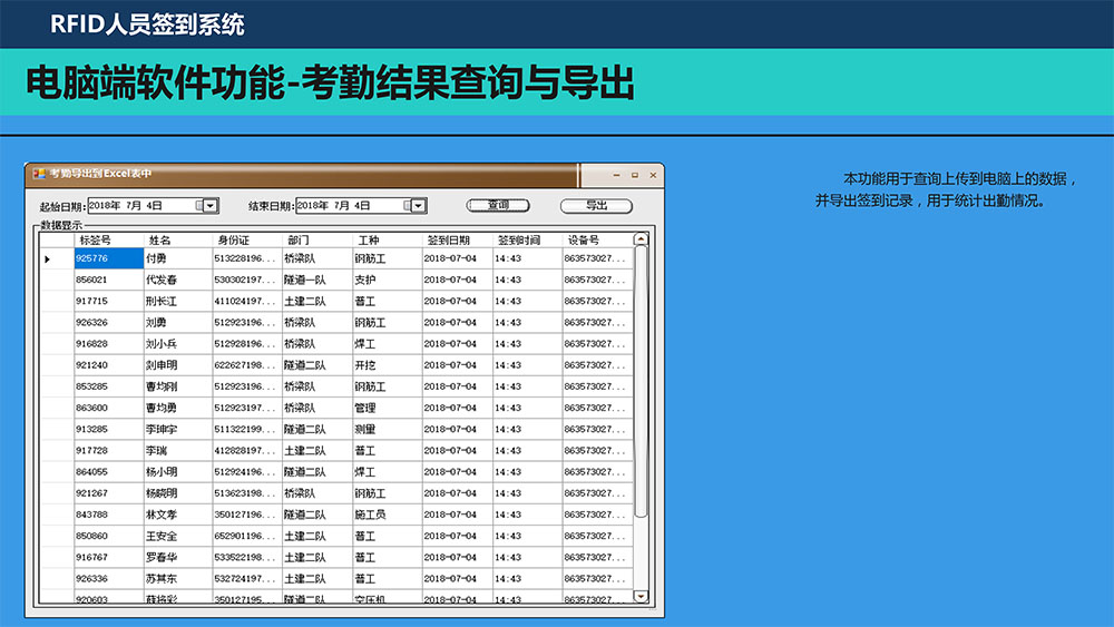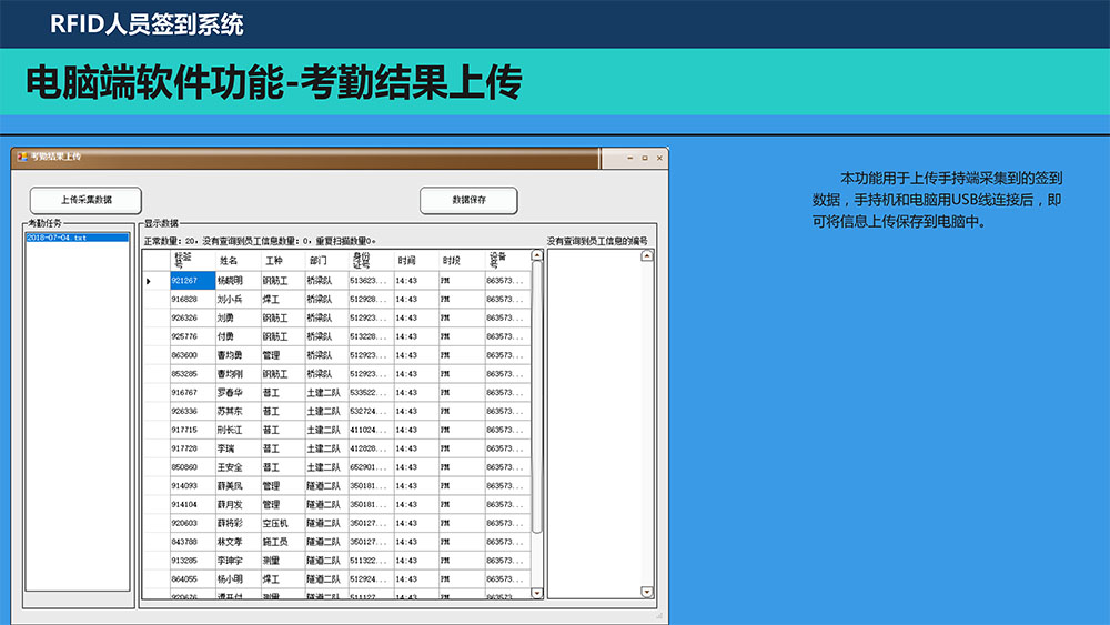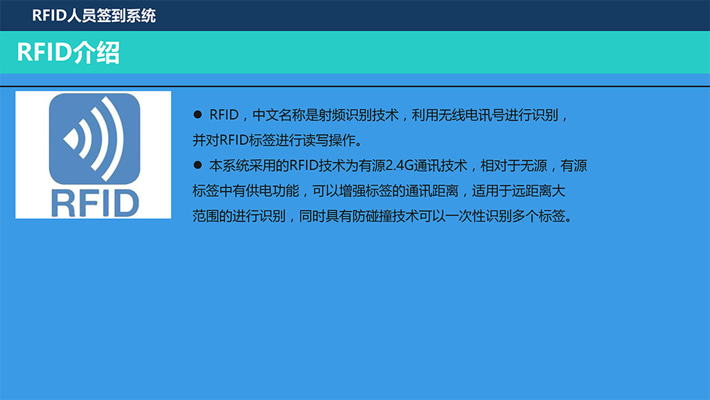 RFID人員簽到管理系統(tǒng)主要是針對各類企業(yè)考勤,重點區(qū)域人員監(jiān)控等應(yīng)用如工地實名制管理,利用RFID讀寫自動識別技術(shù),紅外對射,以及后臺管理軟件集成的一種高檔,高效的考勤簽到方案。主要由開放式通道門以及紅外識別經(jīng)過的人身上帶著的RFID電子標(biāo)簽,結(jié)合紅外判斷進(jìn)出人員的方向,以及是否帶卡,是否多帶卡等信息以實現(xiàn)考勤,區(qū)域定位等功能。